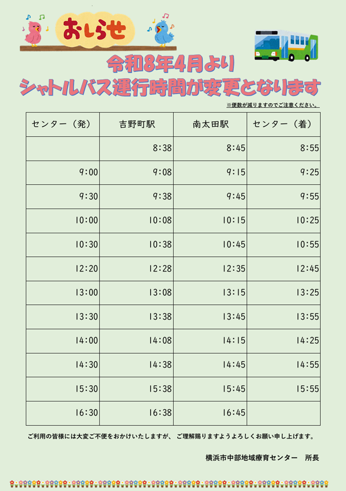 | センター(発) | 吉野町駅(発)(3番出口) | 南太田駅(発) | センター(着) |