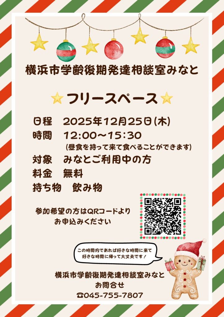 2025年12月25日(木)12:00~15:30の間、フリースペースを開放いたします。